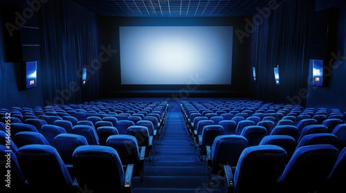 Fototapeta premium Empty Cinema Theater, Blue Seats, Big Screen