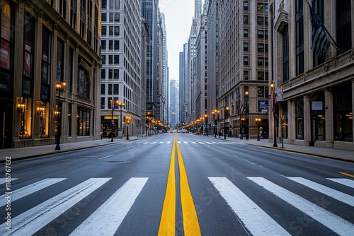 © Nurul, Fototapeta premium Empty city street at dawn, yellow lines, skyscrapers.