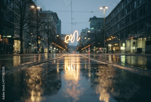 © andyaziz6, Obraz premium Empty city street at night with wet pavement reflecting streetlights and buildings