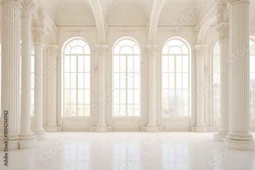 Naklejka premium Empty classical room featuring ornate columns, arched windows, and white...