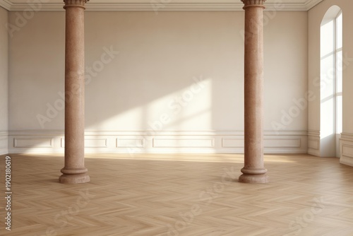 Naklejka premium Empty classical room interior with two columns, parquet floor, and sunlight streaming through a window