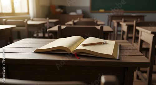 © THIBNH, Fototapeta premium Empty classroom desk with open book and pencil on wooden table symbolizing education study and knowledge learning 83844729 1