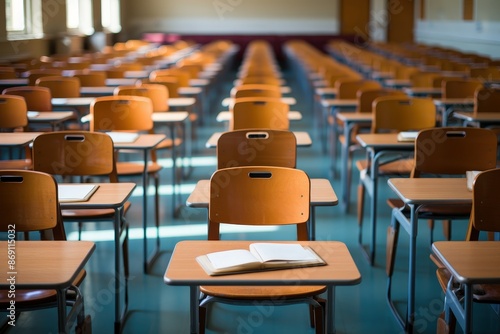 © Nice Seven, Naklejka premium Empty Classroom Desks and Chairs with a Book