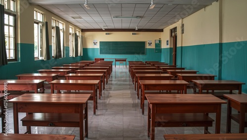 © The 2R Artificiality, Naklejka premium Empty classroom featuring wooden desks and chairs, no students present during a pandemic lockdown