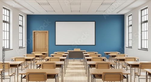 © Rizky, Naklejka premium Empty Classroom with Blue Walls and Blank Projection Screen