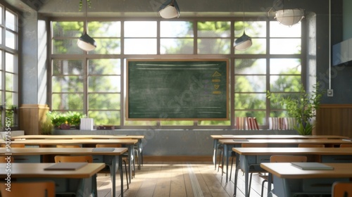 Obraz premium Empty Classroom With Chalkboard and Sunlight.