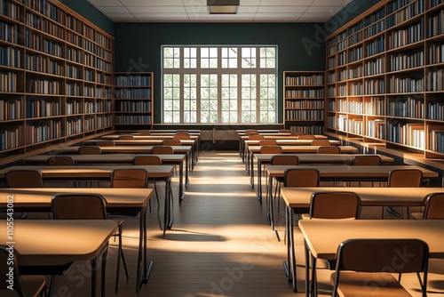 © Viktor, Obraz premium Empty classroom with many desks, bookshelves. Sunlight streams in through large window. Study space ready for students. Education concept for schools, colleges. Ideal for educational material.