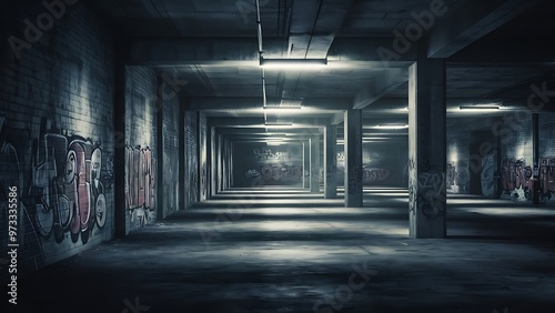 © Kartik, Obraz premium Empty commercial parking garage with a grunge concrete brick wall, overhead lighting and pillars with empty bays