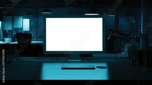 Naklejka premium Empty computer screen in a dark office workspace.
