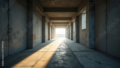 Obraz premium Empty Concrete Hallway with Sunlight at the End