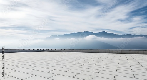 © Lucianastudio, Fototapeta premium Empty concrete rooftop terrace overlooking a misty mountain range under a cloudy sky