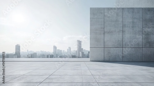 Fototapeta premium Empty concrete rooftop with city skyline in the background.