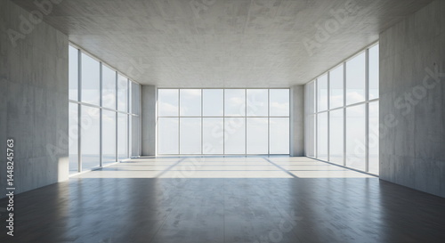 © Pixel Spark, Obraz premium Empty concrete room large windows sunlight