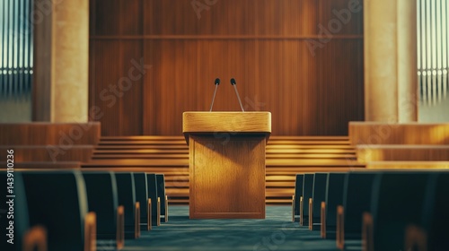 © soem, Obraz premium Empty conference stage with a podium and microphones ready for a speaker.