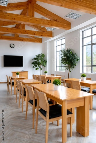 © kardaska, Fototapeta premium Empty contemporary classroom with wooden furniture and exposed beams