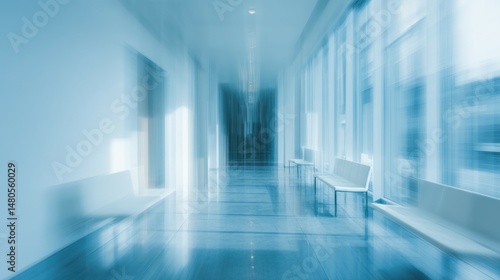 © Diego, Fototapeta premium Empty corridor with benches and large windows in modern building