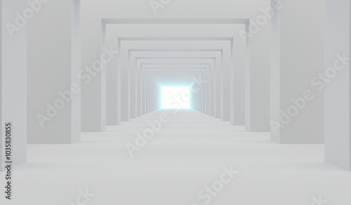 © nana, Fototapeta premium Empty corridor with many square arches in perspective view. Abstract architecture. Arch. Interior design. Step forward. Philosophical classic. Illuminated corridor. 3D illustration.