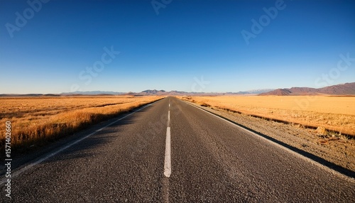 Naklejka premium empty cracked asphalt road stretching straight into the horizon under clear blue sky with golden fields and distant low mountains bathed in warm sunlight