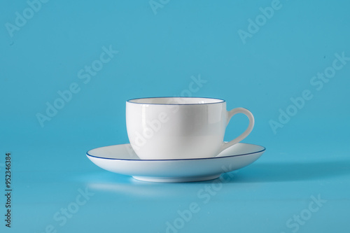 © Andrey Nikitin, Obraz premium Empty cup and saucer on a blue background.