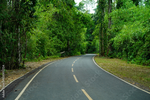 Fototapeta premium Empty curved concrete roadway winds through a green nature park with trees in the forest, Thailand.