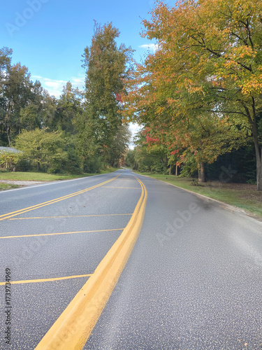 © KaihkoImages, Fototapeta premium Empty Curved Road in Autumn Woods