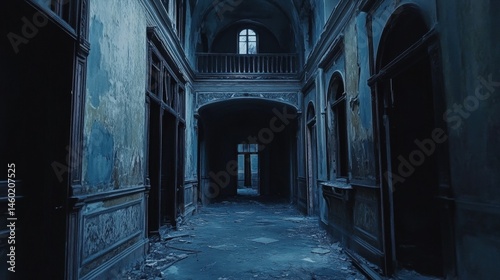 © Prism Trail, Fototapeta premium Empty, decaying hallway within a dilapidated mansion.