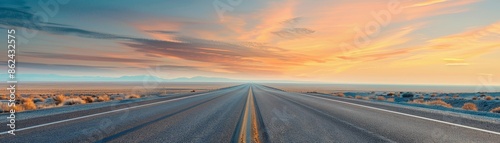 Naklejka premium Empty desert highway at sunset with dramatic clouds and vibrant colors, perfect for travel and adventure themes