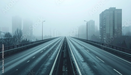 Fototapeta premium Empty elevated freeway vanishing into dense early morning fog
