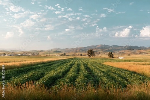 © SEUNGJIN, Fototapeta premium Empty farm, landscape and crops in environment, countryside and outdoor with clouds in sky. Plants, vegetables and nature with agriculture, sustainability and food production