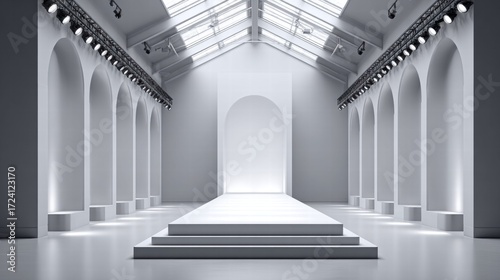 © FramePulse, Obraz premium Empty fashion runway stage with bright lights and architectural design.