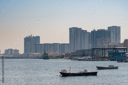 © laphotography, Fototapeta premium Empty fishing boats on the sea, waiting for its net catch during daytime in the Middle East with city building in the background