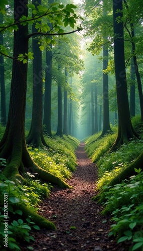 © Sarayuth, Fototapeta premium Empty forest path with fallen trees and overgrown vegetation, decay, wild, moss