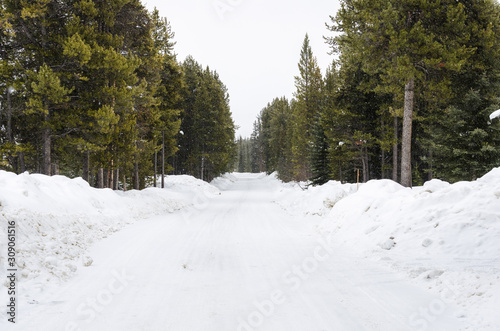Naklejka premium Empty forest road covered in snow during a snowstorm. Treacherous driving conditions.