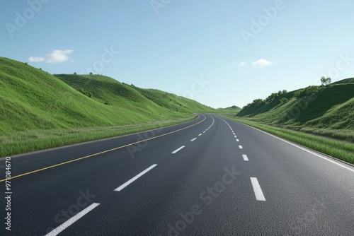 © Anjali, Fototapeta premium Empty Four Lane Freeway with Dashed Lines and Grass Hillside