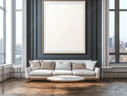 Fototapeta premium Empty Frame, Modern Living Room, City View, Daytime Interior