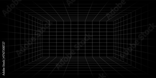 © Moh, Naklejka premium Empty futuristic digital box room grey-black background with white grid space line color surface. Network cyber technology. banner, cover, terrain, sci-fi, wireframe, and related to background.Print