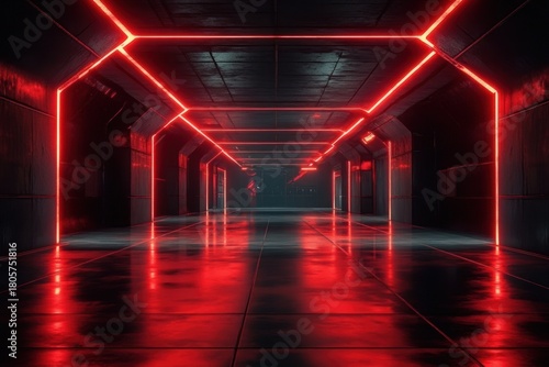 Fototapeta premium Empty futuristic industrial corridor with glowing red neon geometric light strips, glossy reflective tiled floor, dark metal walls and strong symmetrical perspective creating a tense, mysterious mood