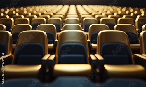 © Ardika Creative, Fototapeta premium Empty gold and black cinema or theater seats rows, spotlight, dark background