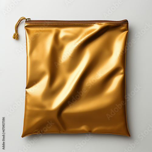 Obraz premium Empty gold metallic pouch mockup, packet, white background "ai generated"
