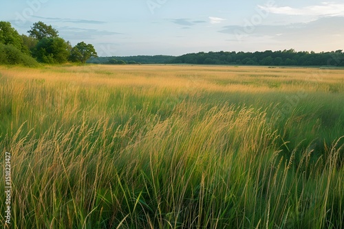 Fototapeta premium Empty golden field with tall grass glowing under sunset, peaceful countryside...