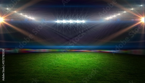 Obraz premium Empty grass pitch is being shown in flat style stadium with floodlight flares...