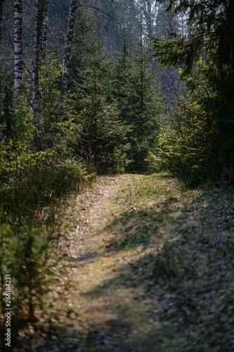 © Martins Vanags, Obraz premium empty gravel dust road in forest with sun rays and shadows