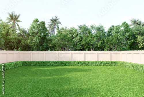 © onzon, Obraz premium Empty green lawn with wooden fence surrounded by nature background 3d render illustration