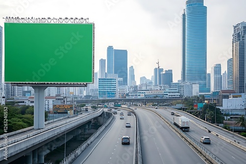 © md, Naklejka premium Empty Green Screen Billboard on Highway Overpass in Cityscape