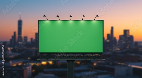 © Abimusa Gallery, Obraz premium Empty green screen billboard with spotlights against a blurred city skyline at sunset.