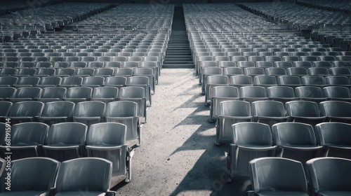 Fototapeta premium Empty grey stadium seats in symmetrical rows, sports arena seating, public event venue, spectator chairs, organized seating, outdoor stadium, event space, crowd seating, stadium architecture, sports