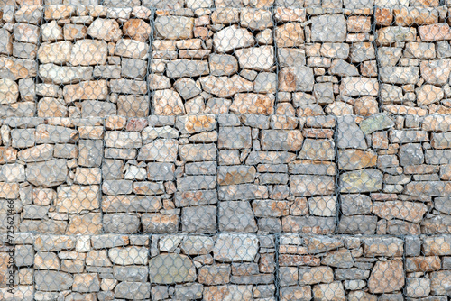 © Rawf8, Fototapeta premium Empty grey stonewall behind wire metal mesh for protection background texture. Copy space