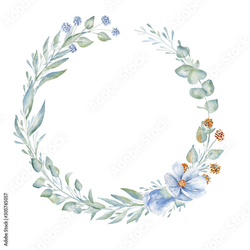 © tanialerro, Fototapeta premium Empty hand drawn floral wreath frame watercolor illustration