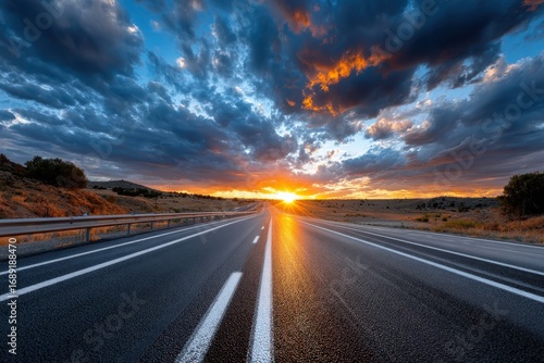 Naklejka premium Empty highway at sunset with dramatic clouds