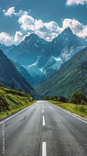 Fototapeta premium Empty highway between mountain peaks, clear sunny day, incredible nature, bright saturated colors
